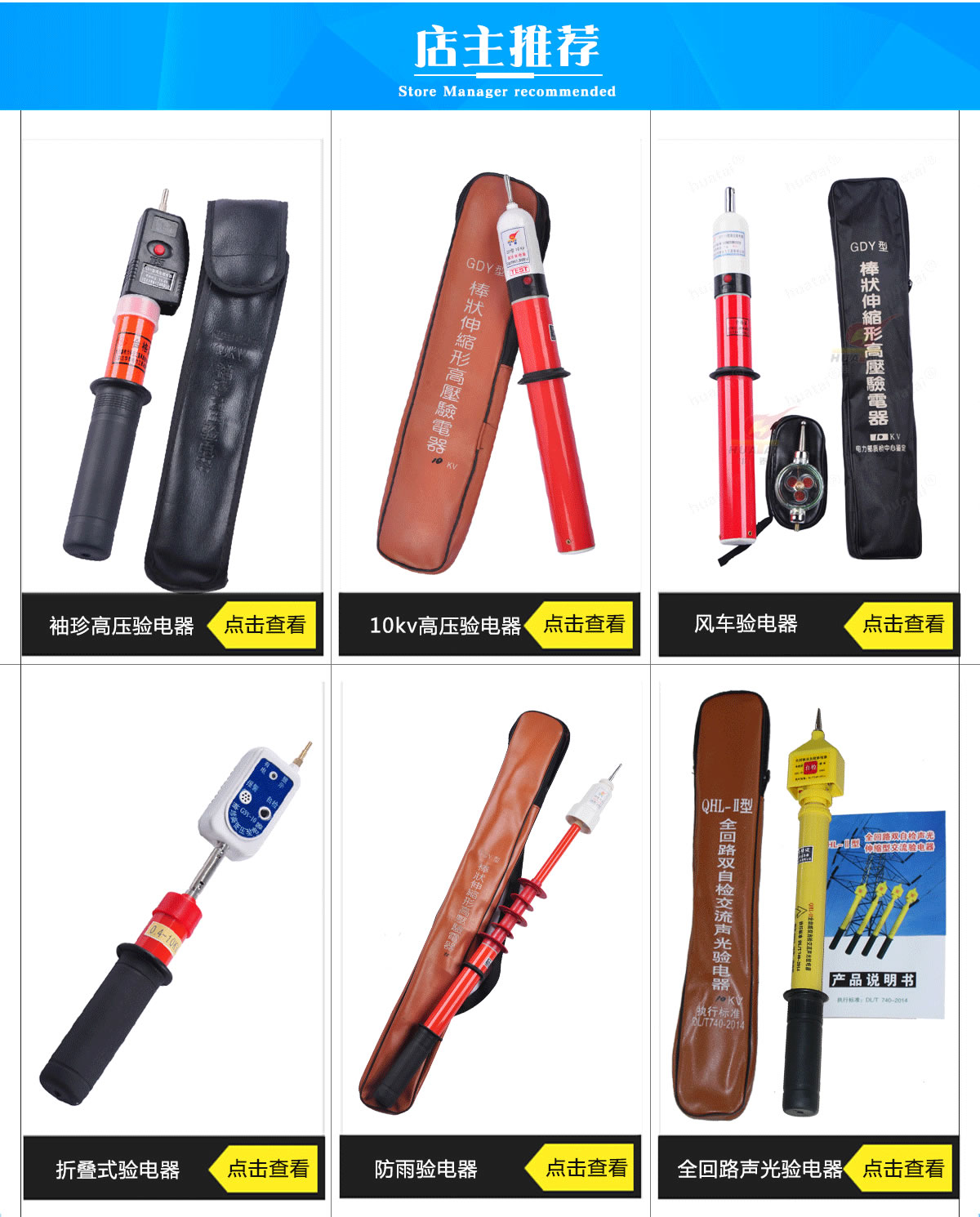 使用方法及注意事項?。ㄒ唬┦褂们案鶕或炿娫O備的額定電壓的等級,選擇適合電壓的驗電器?! 。ǘ炿娗皯獙︱炿娖鬟M行自檢試驗,使用III型時。須同時按住自檢導電金屬開關和觸電探針,驗電  指示器發(fā)出間歇振蕩聲光訊號,則證明驗電器性能完好,即可進行驗電,此時可將伸縮絕緣桿拉開進行驗電操作,手不能超過規(guī)定的安全環(huán),驗電器觸頭與等級的帶電體觸示,即可發(fā)出間歇聲光訊號表示有電,否則表示無電。  ?。ㄈ└鼡Q電池。擰開驗電器上蓋,便可更換電池。本品電路工作于電子自動關閉,長期連待命,有信號輸入則開,無信號便自動關閉,功耗小,無需常換電池。所以采用AG13號氧氣銀電池4粒,電壓6V。自檢不能發(fā)出聲光訊號時再考慮更換電池。  ?。ㄋ模楸WC人身和設備的安全,請根據電業(yè)安全規(guī)定要求定期作預防性試驗。根據【電業(yè)安全工作規(guī)程】規(guī)定驗電器在電器設備上驗電操作時應遵照電業(yè)安全工作規(guī)程進行。預防性試驗前,應進行外觀檢查。當發(fā)現(xiàn)驗電指示器的外殼有缺損,絕緣桿有裂紋等明顯缺陷時不宜進行預防性試驗,應及時送交更換。