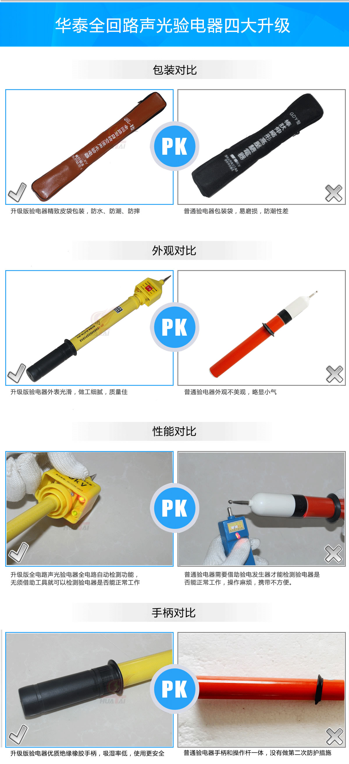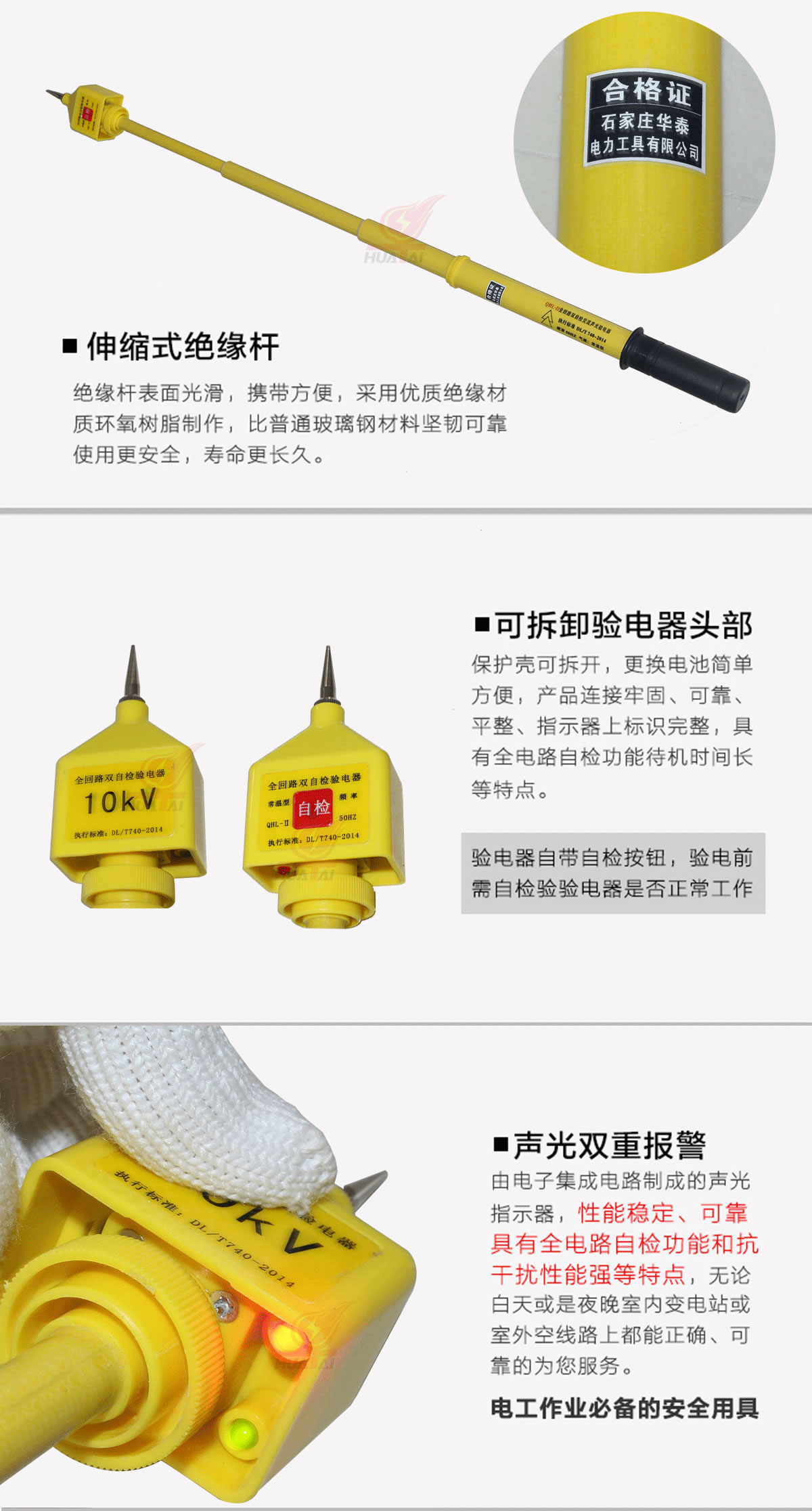 全回路雙自檢交流聲光驗電器是我公司采用國際先進技術和我們雄厚的技術力量以及多年來的制造研究所生產的一款新型交流驗電器,它具有靈敏度高,不受強電場干擾,具有全回路自檢功能,安全系數高,整體采用閉合電路設計,外殼用注塑ABS工程塑料一次成型,桿體延續(xù)棒狀伸縮環(huán)氧樹脂絕緣桿,耐壓等級及安全系數比傳統(tǒng)驗電器提高3倍。