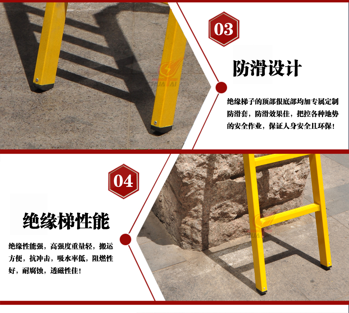 梯撐、梯腳防滑設(shè)計(jì)不易疲勞,梯各部件外形無尖銳棱角,安全程度高,絕緣性能強(qiáng);吸水力低,耐腐蝕。
