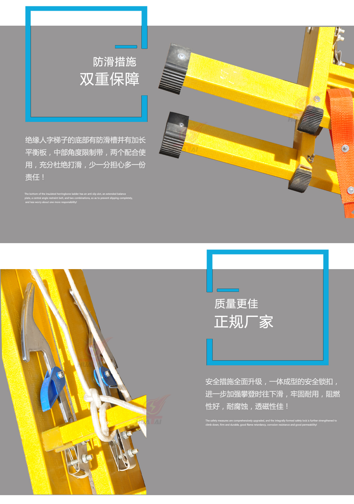 電工絕緣梯是使用以玻璃纖維和環(huán)氧樹(shù)脂為主要材料而拉擠成型的玻璃鋼型材加工而成的梯子。它具有高強(qiáng)度、耐腐蝕、外形美觀的優(yōu)點(diǎn)并具有良好的電絕緣性能。通??梢阅褪堋?20kV/m”的工頻試驗(yàn)電壓。因此玻璃鋼梯可以作為電力系統(tǒng)的安全登高工具。用以替代金屬梯以及竹木梯。防止感應(yīng)電及防誤操作引起的觸電事故。經(jīng)過(guò)嚴(yán)格測(cè)試檢驗(yàn)的玻璃鋼梯還可以用做高壓帶電作業(yè)用梯。