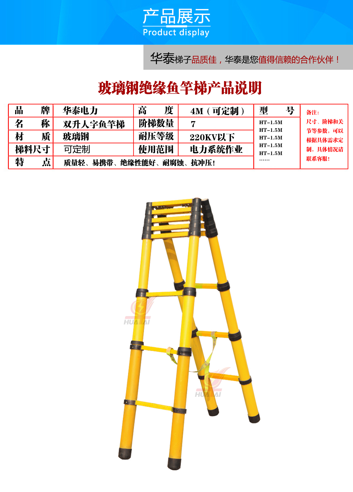 (1)黑邊雙升魚竿梯不導(dǎo)電,外觀新穎,美觀大方。