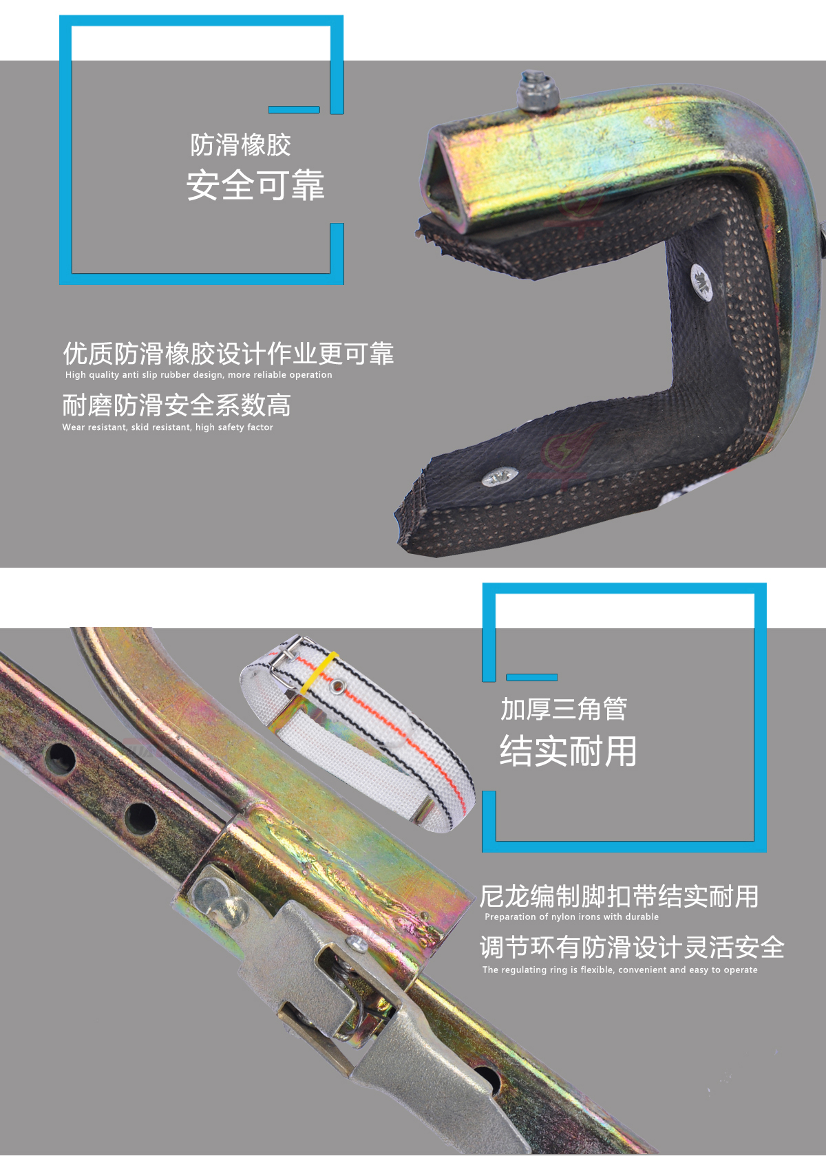 可調(diào)節(jié)卡套環(huán):靈活度高,操作方便簡單精密焊接堅固耐用,是電工爬不同規(guī)格的桿理想工具