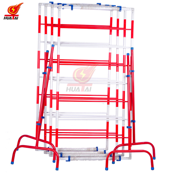 圍網(wǎng)為紅白相間;外形美觀;圍網(wǎng)的上邊沿配“止步,高壓危險(xiǎn)”警示牌; 支撐桿采用鐵桿、不銹鋼、環(huán)氧樹脂等材料制成, 上面設(shè)有掛鉤或夾子, 可以牢固張掛聚酯網(wǎng), 使之不易被掀起脫離; 底座有鑄鐵和收縮式鐵叉等,可供用戶選擇搭配使用。