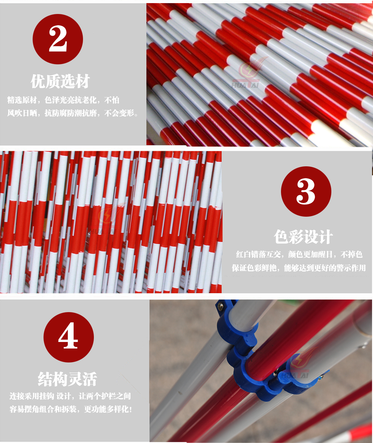 安全圍欄紅白相間,色彩鮮明,絕緣性好,強(qiáng)度大,實(shí)用性強(qiáng) 圍欄的用途:車間隔離用,工廠,電廠等。