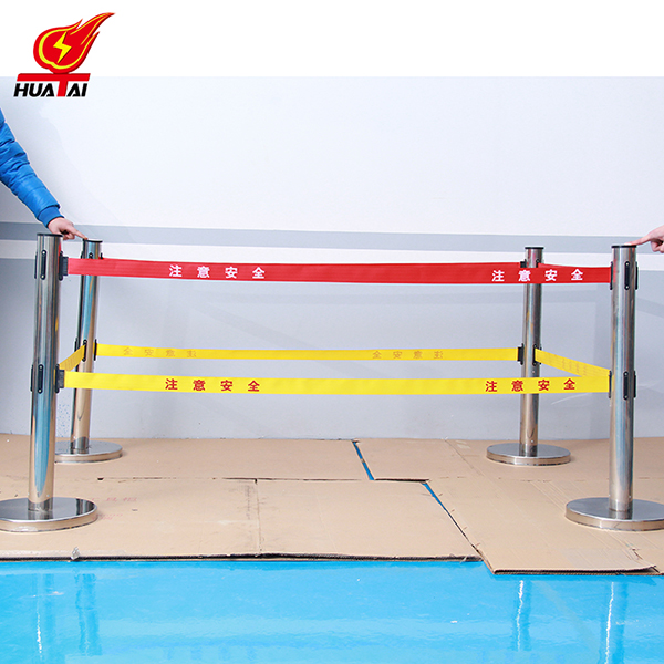 帶式伸縮圍欄 高度1米,筒體的直徑是76mm,筒的壁為0.8個厚,底盤是 350mm。     帶子最長做到5米,帶寬5cm 。可以雙層也可以單層帶子,兩層帶子的間距30厘米,一般是上紅下黃,紅色帶子上印 黃字(白字),黃色帶子上印紅字。這樣比較醒目。字分熒光字和普通字。 “閃電符號 止步 高壓危險/危險/止步 危險”  等等,可以根據(jù)客戶要求定做。每根立柱上都含有帶子,四個方向都可以掛帶子。熒光式安全警示帶圍欄,產(chǎn)品設計精美,使用靈活,隨意伸縮,隨意間距,和分割 形狀,無限連接等特點。